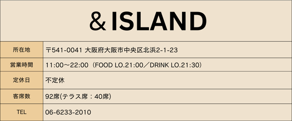 4つ目は大阪市中央区の北浜エリアにある「&ISLAND(アンドアイランド) 」です!