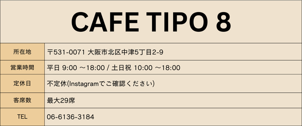 2つ目は梅田のスカイビルから徒歩30秒の場所にある 「CAFE TIPO 8(カフェ チーポ・オイト)」です!