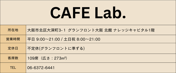 まず1つ目にご紹介するのは、大阪市北区梅田エリア グランフロント大阪北館1Fにある「CAFE Lab.(カフェラボ)」です!