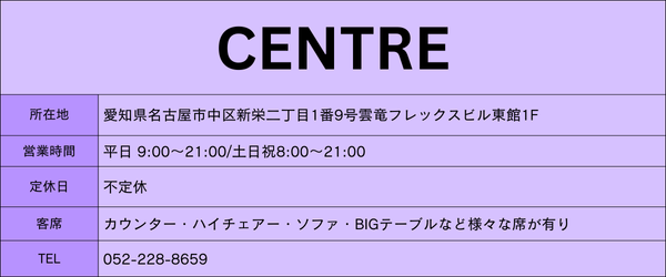 ※CENTREは予約不可となっております。直接店舗へお尋ねください。