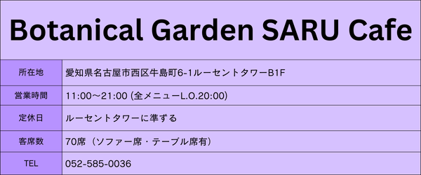 まず1つ目にご紹介するのは、名古屋ルーセントタワーの地下1Fにある「Botanical Garden SARU Cafe」です!