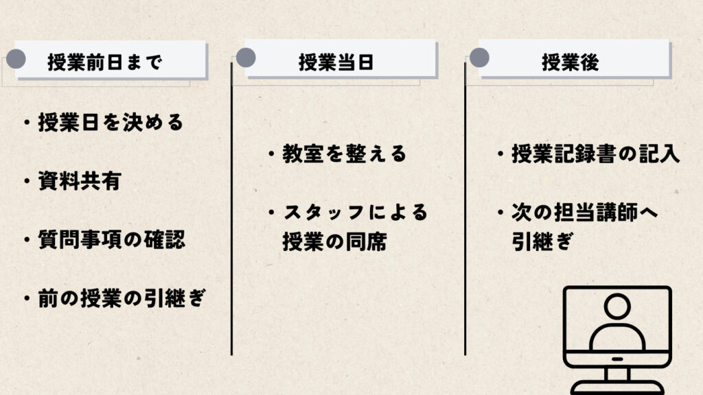 そして、講師の方に資料や質問事項の共有、前の授業の引継ぎなどを行います。