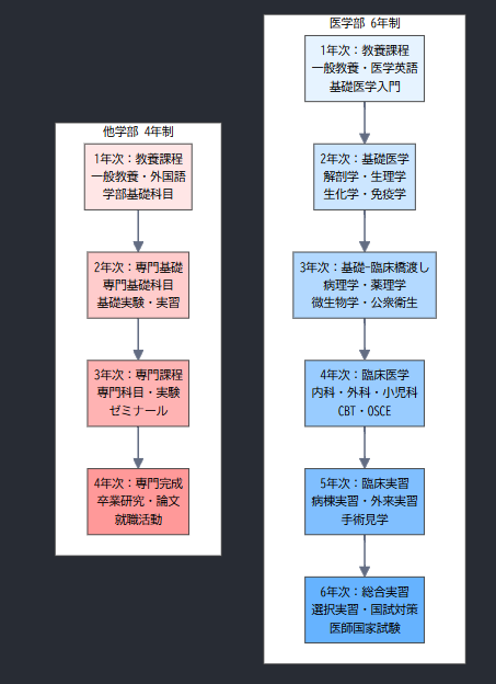 医学部と他学部のカリキュラムを比較してみると、こんな感じになるでしょうか?
