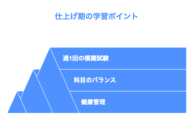 試験2か月前からは模擬試験形式での演習を重視し、本番の時間配分を意識した学習を行う。この時期は新たな知識の習得よりも、これまでの学習内容の定着と実践力の向上に焦点を当てる。