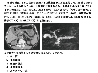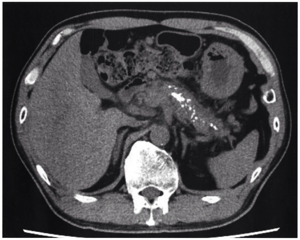 54歳の男性。下痢を主訴に来院した。2ヵ月前から下痢が出現し軽快しないため受診した。便回数は1日に6〜7回、便性状は泥状から水様であり、揚げ物を食べると脂肪便を認める。便に血液の付着はない。飲酒は日本酒 6合/日を34年間。身長174cm、体重58kg。血圧132/70mmHg。腹部は平坦、軟で圧痛を認めない。腸雑音はやや亢進している。血液生化学所見:アミラーゼ 28U/L(基準44〜132)、空腹時血糖140mg/dL、CEA 3.0ng/mL(基準5以下)、CA19-9 37U/mL(基準37以下)。腹部単純CTを次に示す。