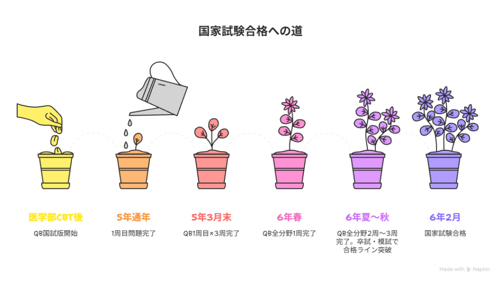 | 4年末〜 | 医学部CBT後にQB国試版開始 | 勢いを活かして前進! |