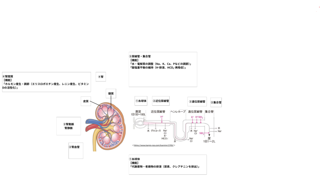 糸球体では、「代謝産物・老廃物の排泄(尿素、クレアチニンを排出)」 、尿細管・集合管では「水・電解質の調整(Na、K、Ca、Pなどの調節)」「酸塩基平衡の維持(H⁺排泄、HCO₃⁻再吸収)」、腎の間質細胞では「ホルモン産生・調節(エリスロポエチン産生、レニン産生、ビタミンDの活性化)」が行われています。