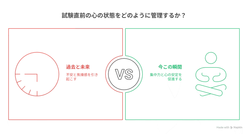 試験直前は、「この分野、勉強足りなかったかも」「去年の問題はどうだったっけ」など、過去や未来に意識が向きがちです。
