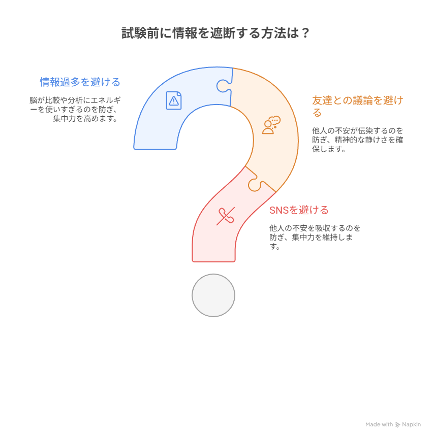試験前にSNSを開いたり、友達と「昨日の過去問どうだった?」と話したりしていませんか?
