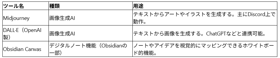 ツール名: Midjourney / Dall-E (OpenAI製) / Obsidian Canvas