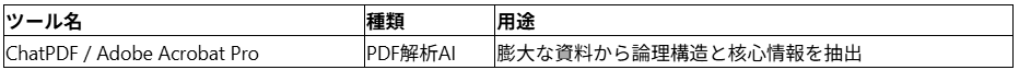 ツール: ChatPDF、Adobe Acrobat Pro(AI機能搭載版)などのPDF解析AI