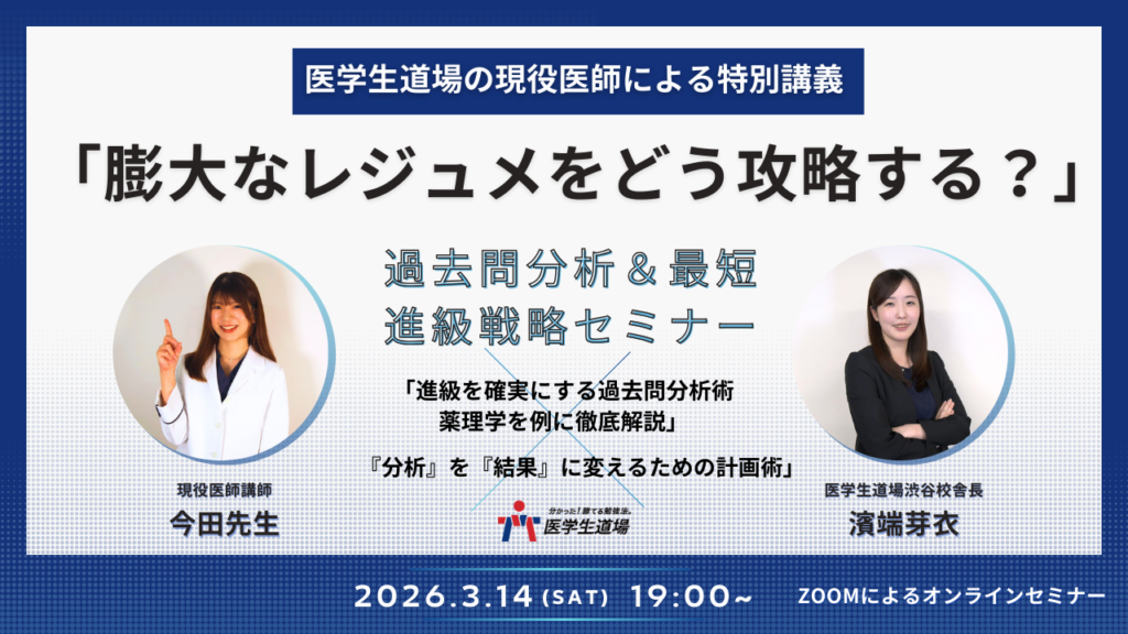 今回の講師は、医学生道場で数多くの学生を救ってきた今田先生。 過去問から試験の傾向をどのように見抜き、200ページ超のレジュメをどう攻略するのか。実際に薬理学の過去問を例に挙げながら、「過去問の使い方のコツ」をすべて公開します。
