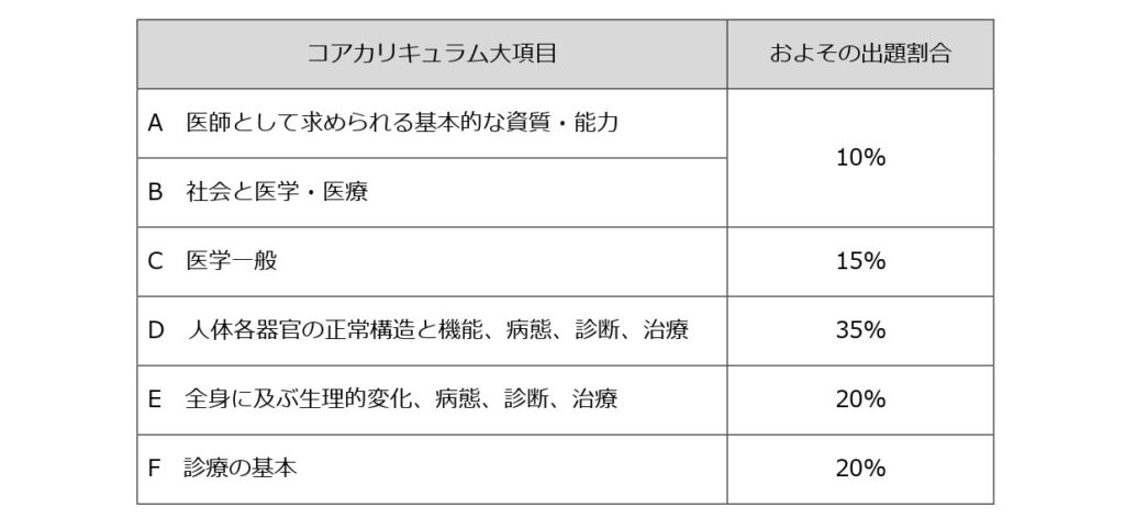 出題範囲については以下の表のとおりです。「医学教育モデル・コア・カリキュラム」に基づいて出題されます。