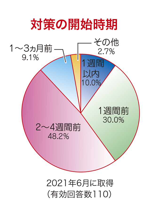 グラフを見ると分かる通り、半数近くの医学生が約2週間前には対策を始めていたようです。