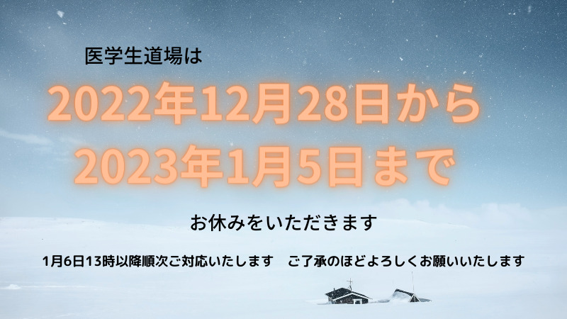 医学生道場は12月28日から1月5日までお休みをいただきます。1月6日以降順次ご対応いたしますのでご了解のほどよろしくお願いいたします。