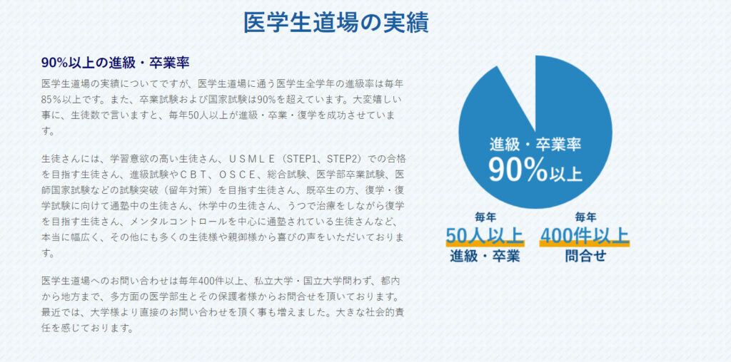 そして!医学生道場には、現在も進級や国試合格を目指して通っている医学生が多数在籍しており、毎年進級・卒業率は90%以上となっています。